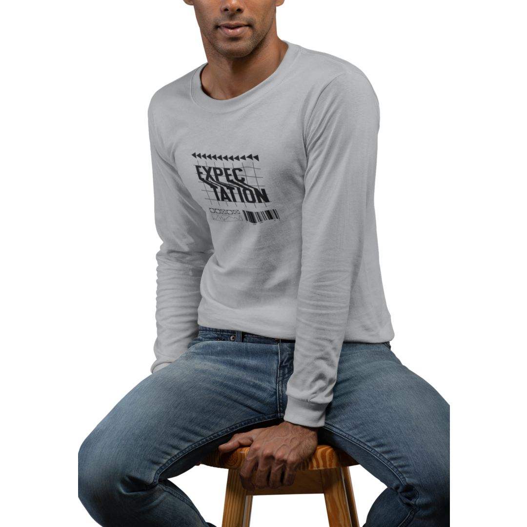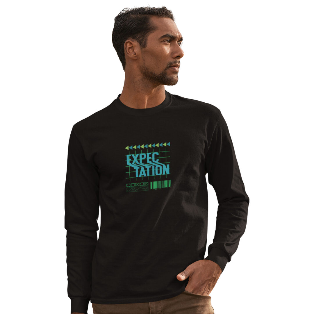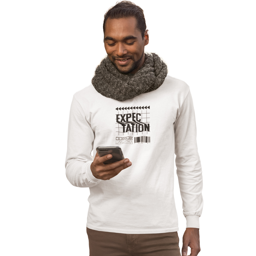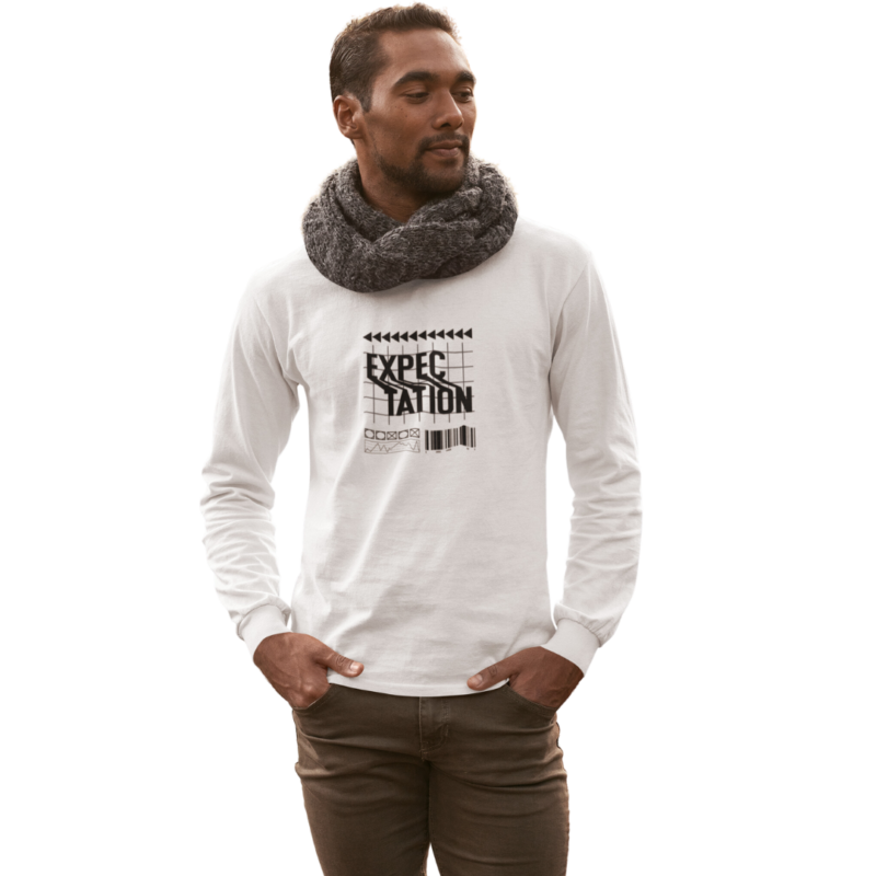 Eleve seu estilo com a Camiseta Manga Longa Masculina em Malha Quality – Edição Expectation. Vista-se com uma mensagem positiva e transmita sua atitude otimista, seja elegante, seja positivo.