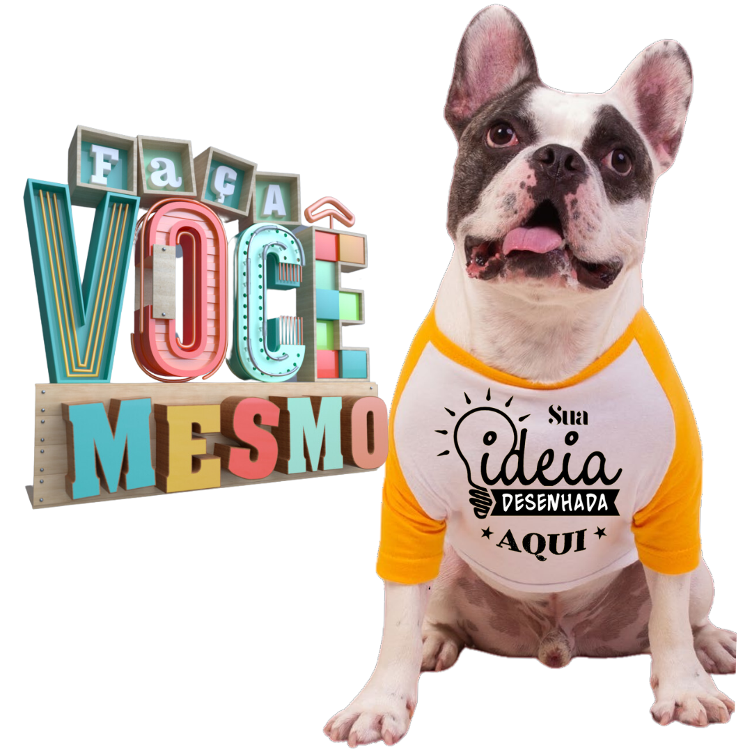 A modelagem é do tipo cava raglan, com o corpo na cor branca e opções de cores preto, amarelo e rosa para as partes da manga e da gola. Você pode projetar a estampa da roupa para cachorro no Studio 3D e personalizar a roupinha da forma como você quiser através do Silk Digital! É uma ótima ideia para quem deseja fazer looks para a família toda com a mesma estampa!